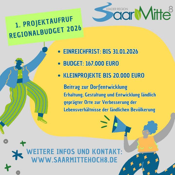 Gefördert werden Kleinprojekte bis max. 20.000 €. Egal ob Verein, Kommune, Initiative, Unternehmen oder Privatperson – wenn Eure Idee einen echten Mehrwert für die Region hat, seid Ihr am Start! Alle Voraussetzungen und Infos zu den Projekten findet Ihr hier: www.saarmittehoch8.de/regionalbudget