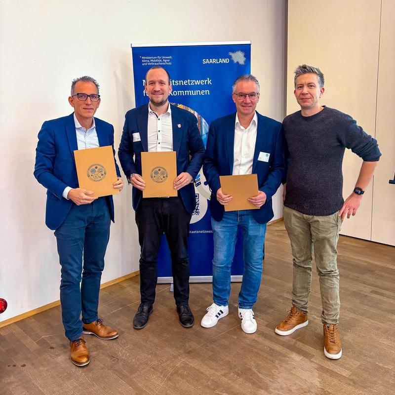 Foto: Staatssekretär Sebastian Thul (r.) mit den Vertretern der neuen Mitgliedskommunen des Mobilitätsnetzwerkes: Frank Wagner für den Landkreis Merzig-Wadern, Andreas Hübgen für die Gemeinde Illingen und Frank John für den Saarpfalz-Kreis (v.l.n.r.)