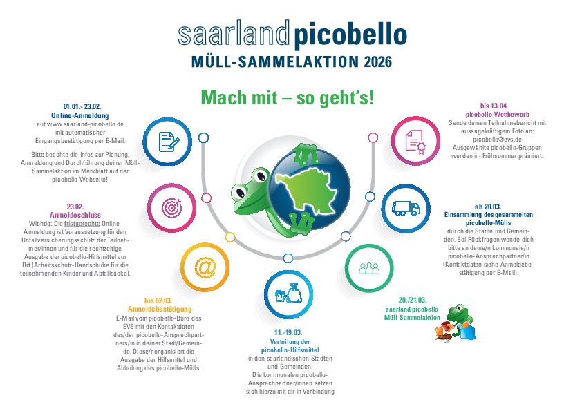 Der EVS ist Träger und Koordinator der Kampagne „saarland picobello“. Die Entsorgung der gesammelten Abfälle erfolgt kostenlos über die EVS-Entsorgungsanlagen. Unterstützt wird die Aktion unter anderem durch Kaufland, das Arbeitsschutzhandschuhe für teilnehmende Kinder zur Verfügung stellt.