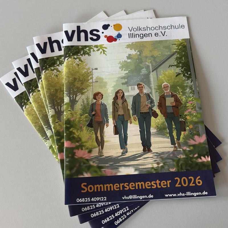 Im kommenden Programmheft oder online finden Sie wieder ein umfassendes Kursprogramm mit den derzeitigen und jederzeit mitgestaltbaren Schwerpunkten: Politik, Kultur, Gesellschaft, Lebenshilfe, Erziehung, Familie, Gesundheit und Gesundheitspraxis, Gestalten und Hobby, Sprachen, Arbeit und Beruf. Zu unserem Angebot gehören außerdem Kulturfahrten und Exkursionen, Einstiegskurse Deutsch als Fremdsprache, die Initiative „Reparaturcafé Illingen“, der Mehrgenerationentreff „Medien|66“, „Smarte Tools“ für Vereine, „VHS-Cinema“, „Mut tut gut“, „Gehirnjogging“, Philosophie, Fitness, Entspannung, Gestaltung, Malen und Zeichnen, Nähen, Musikmachen, Fotografieren, Sprachenlernen, EDV, KI und vieles mehr. Wir bieten individuelle Beratung, kundenfreundliche Öffnungszeiten, ein Ferienprogramm sowie ein umfangreiches Vortrags- und Veranstaltungsangebot, das eng mit den lokalen Interessen der Verbände, Vereine und tragenden Institutionen der Gemeinde Illingen vernetzt ist. Lebenslanges Lernen – bei uns ist es möglich. Schauen Sie mal rein! Ihre Ansprechpartner: die neue Geschäftsführerin Leyla Acar, Frank Schuppener sowie Petra Baltes und ein erfahrenes Vorstandsteam im Hintergrund. Wir wünschen viel Freude mit dem Programm, empfehlen Sie uns weiter. Anmeldungen, Fragen und Auskünfte im Sekretariat, montags–donnerstags von 9:00–12:00 und 14:00–16:00 Uhr, Tel. 06825/409122.