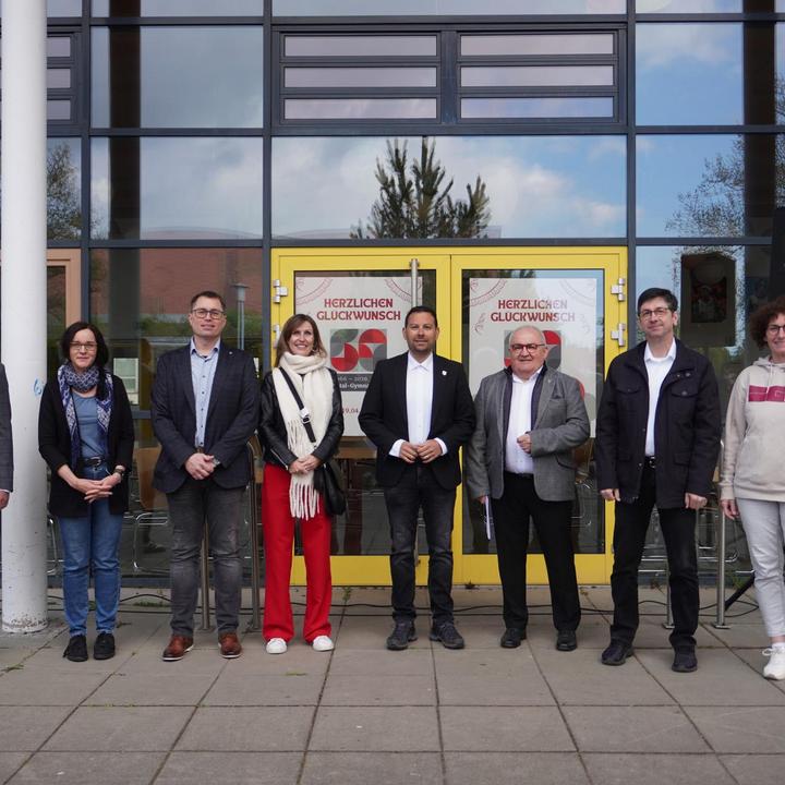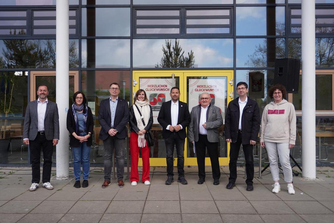 Im Rahmen der Feierlichkeiten begrüßte Schulleiter Armin Claus die Schülerinnen und Schüler sowie die Lehrkräfte, die sich auf dem Schulhof vor dem Bistro versammelt hatten. Zu den Gratulanten zählten zudem die Schulelternvertretung, die Schulleitung der benachbarten Arnold-Fortuin-Gemeinschaftsschule sowie der Erste Kreisbeigeordnete Klaus-Dieter Woll, der die Glückwünsche des Landrates Sören Meng überbrachte.